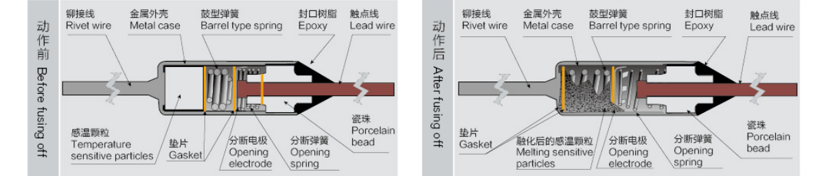 Pelet tipi termal kesme-- ortam sıcaklığı termal kesme çalışma sıcaklığına ulaştığında pellet erir, A yayı genişler ve sürgü kontağını A ucundan uzaklaştırır. Daha sonra elektrik devresi kalıcı olarak kesilir.